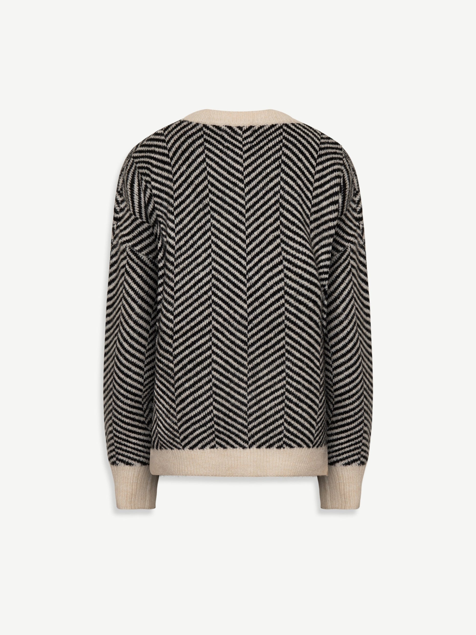 Der Rundhalsausschnitt rahmt das Gesicht elegant, während lange Ärmel die Linie optisch strecken. Der leicht lockere Schnitt umspielt die Figur, schenkt Bewegungsfreiheit und Selbstvertrauen – das grafische Muster setzt die Konturen subtil in Szene.